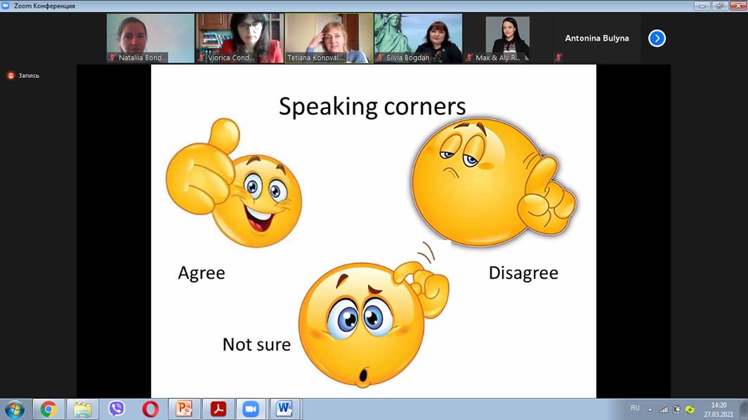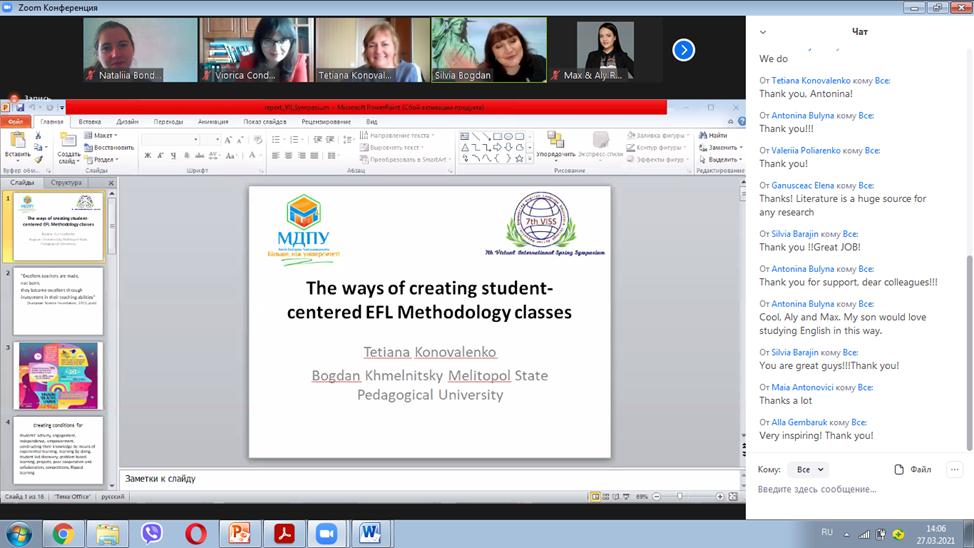 25-26 березня здобувачі третього рівня вищої освіти Наталя Бондар, Альона і Максим Рутковські разом зі своїм науковим керівником Тетяною Коноваленко взяли участь у VII Міжнародному віртуальному весняному симпозіумі «Empowering English language educators through action research», організованому Бєльцьким державним університетом Алеку Руссо (Молдова), Міжнародною асоціацією вчителів іноземних мов, Американським центром в м. Бєльці, Міжнародною організацією вчителів англійської мови як іноземної (TESOL Ukraine).