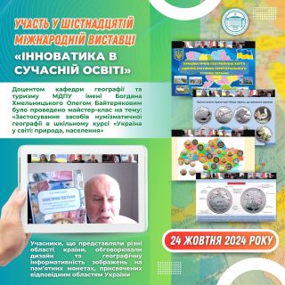 🗺️👨🏼🏫24 жовтня 2024 року в рамках Шістнадцятої міжнародної виставки «Інноватика в сучасній освіті»доцентом кафедри географії та туризму МДПУ імені Богдана Хмельницького Олегом Байтеряковим було проведено майстер-клас на тему: 🪙🇺🇦«Застосування засобів нумізматичної географії в шкільному курсі «Україна у світі: природа, населення».