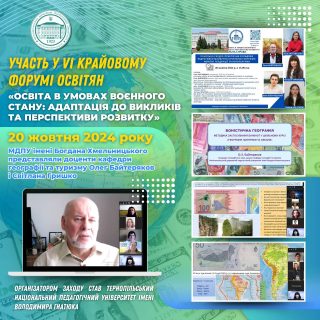 20 жовтня 2024 року доценти кафедри географії та туризму О. Байтеряков і С. Гришко взяли участь у VIКрайовому форумі освітян «Освіта в умовах воєнного стану: адаптація до викликів та перспективи розвитку», що проводився Тернопільським національним педагогічним університетом імені Володимира Гнатюка.