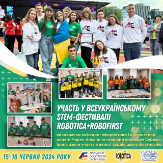 👩🏼🎓⭐️ 15-16 червня 2024 року викладачки кафедри інформатики і кібернетики доц. Чорна Альона Віталіївна та ст. викл. Сердюк Ірина Миколаївна взяли участь в якості суддів на Всеукраїнському STEM-фестивалі ROBOTICA+ROBOFIRST (м. Київ).