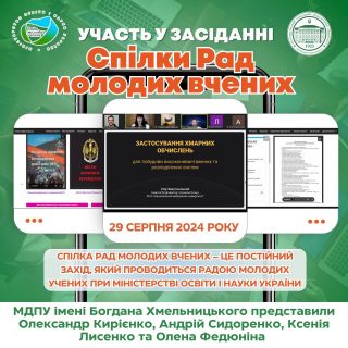 29 серпня 2024 року представники Ради молодих вчених Мелітопольського державного педагогічного університету імені Богдана Хмельницького Олександр Кирієнко, Андрій Сидоренко, Ксенія Лисенко, Олена Федюніна взяли участь у засіданні Спілки Рад молодих вчених.