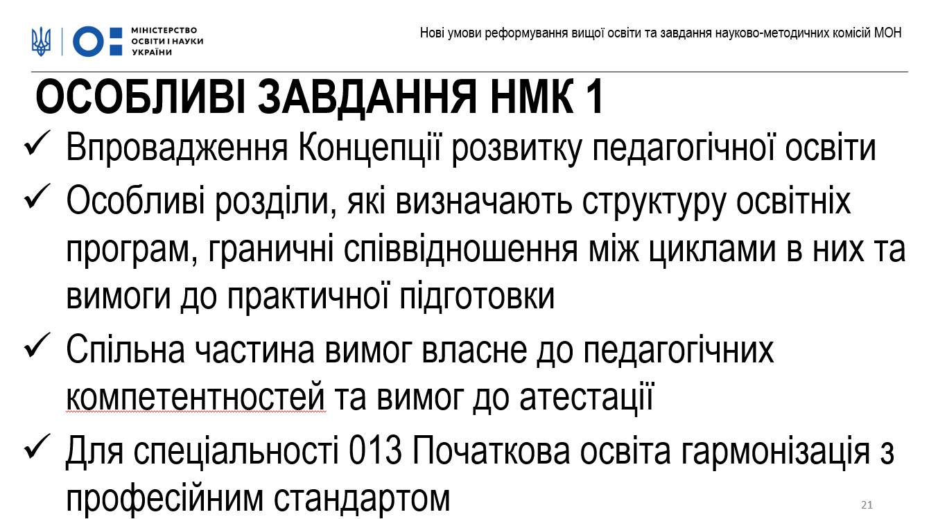 Особливі завдання НМК 1 із загальної, професійної освіти та спорту: