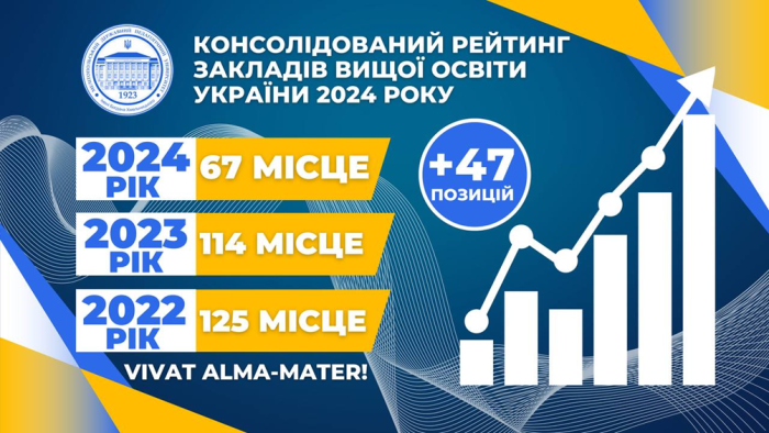 Консолідований рейтинг закладів вищої освіти України за 2024 рік надає Університету 67 місце. (https://osvita.ua/vnz/rating/51741/). У 2023 році Університет посів 114 місце в ньому. Підвищення у рейтингу свідчить про стабільність і стійкість нашого Університету та позитивну динаміку розвитку. (Рис. 1)