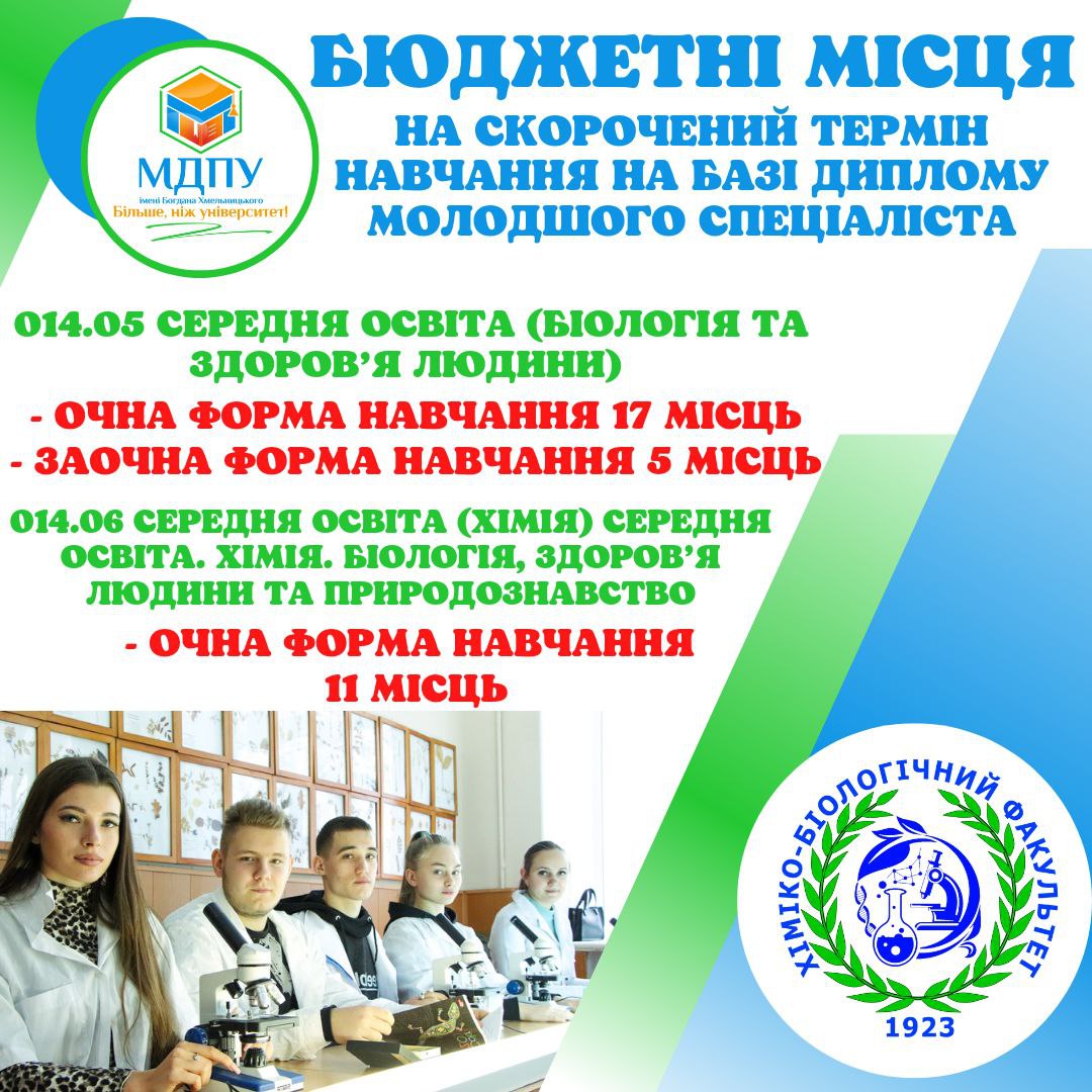 УВАГА! Важлива інформація стосовно наявності бюджетних місць на скорочений термін навчання на базі диплому молодшого спеціаліста на спеціальності хіміко-біологічного факультету: