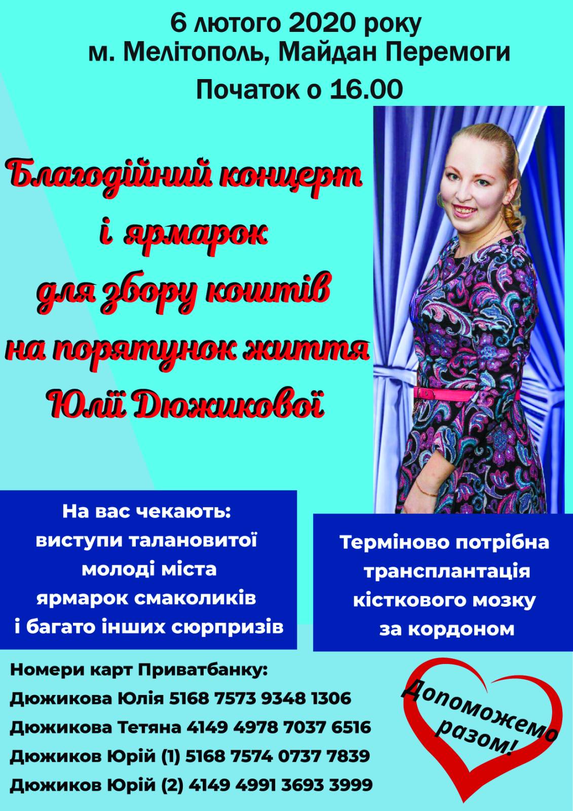 По инициативе Мелитопольського государственного педагогического университета имени Богдана Хмельницкого 6 февраля на Площади Победы с 16.00 до 19.00 пройдёт БЛАГОТВОРИТЕЛЬНЫЙ МАРАФОН В ПОДДЕРЖКУ ЮЛИИ ДЮЖИКОВОЙ.
