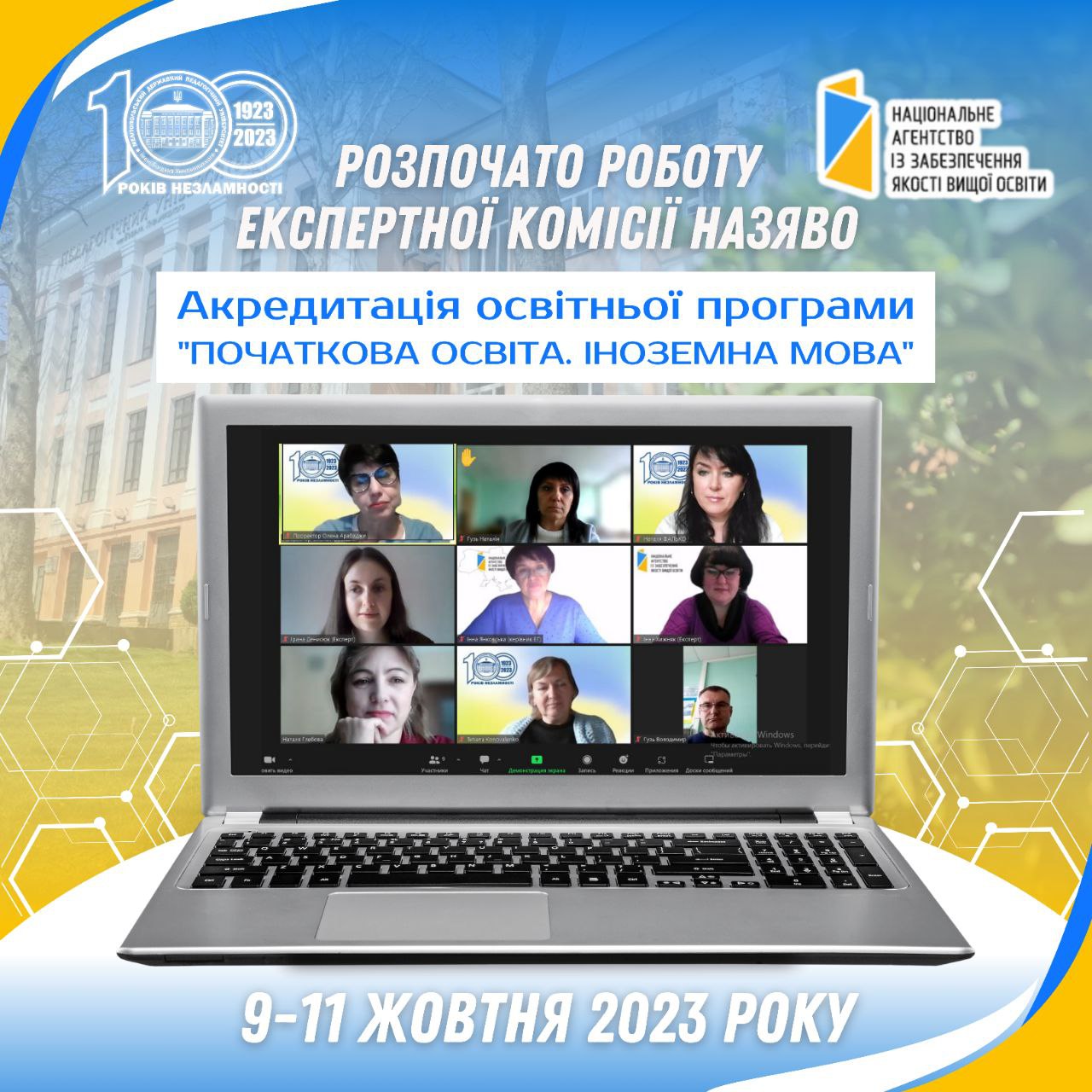 Відповідно до наказу Національного агентства із забезпечення якості вищої освіти від 22 вересня 2023 року № 1035 – Е «Про призначення експертної групи» для проведення акредитаційної експертизи у віддаленому (дистанційному) режимі за освітньої програмою «Початкова освіта. Іноземна мова» за спеціальністю «013 Початкова освіта» (ID у ЄДБО 28797) за другим рівнем вищої освіти в МДПУ імені Богдана Хмельницького розпочала роботу експертна група у складі: