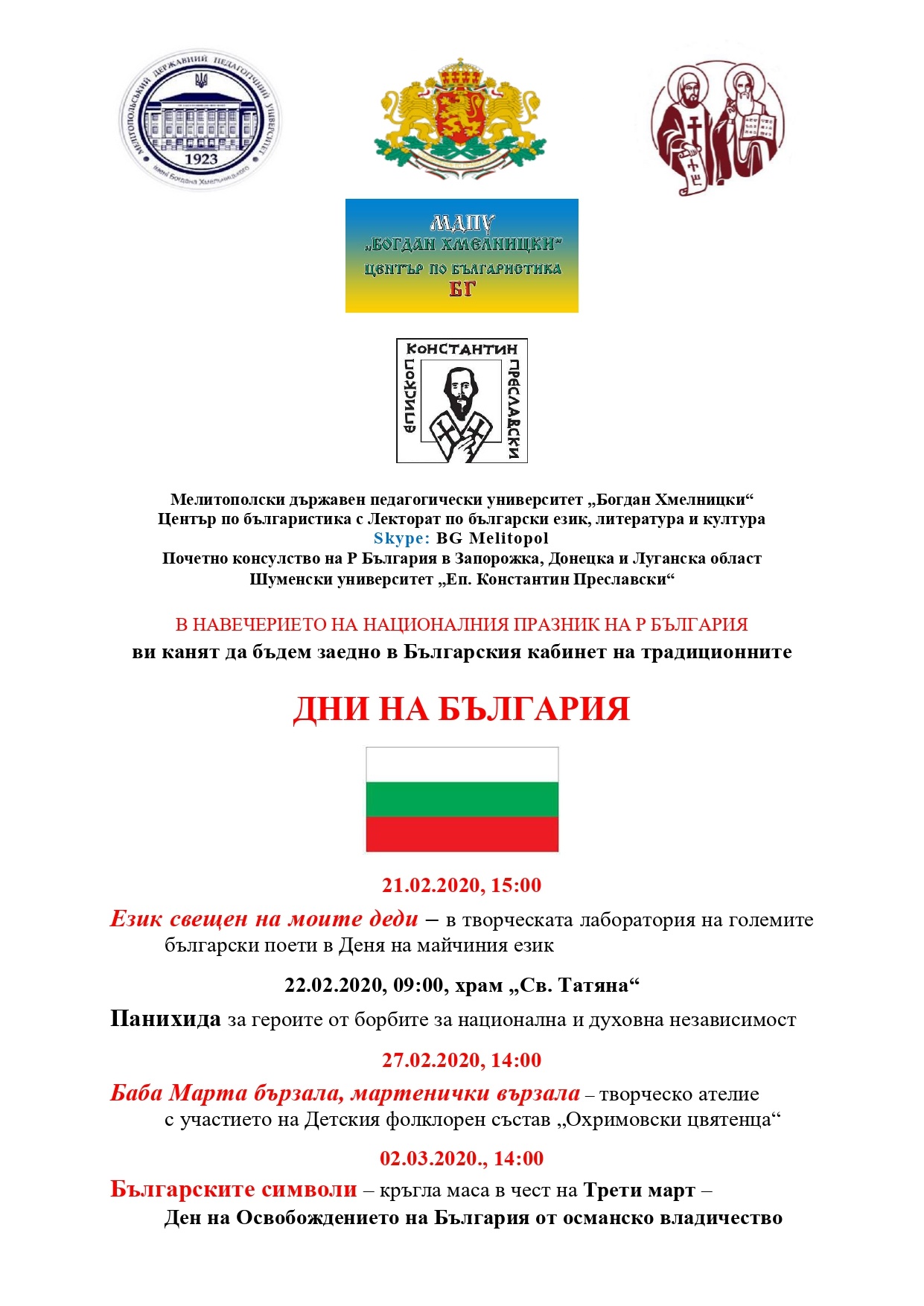 З 21 лютого по 2 березня 2020 року в Мелітопольському державному педагогічному університеті імені Богдана Хмельницького пройшли Дні Болгарії, організовані Центром болгаристики та лекторатом болгарської мови, літератури та культури у партнерстві із Шуменським університетом «Єпископ Костянтин Преславський» та Почесним консульством Республіки Болгарія у Запорізькій, Донецькій та Луганській областях.