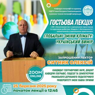 🌍✈️Кафедра географії та туризму запрошує стати учасником гостьової лекції з ОК «Землезнавство з навчальною практикою та курсовою роботою. Модуль 1. Метеорологія і кліматологія з навчальною практикою» на тему: “Глобальні зміни клімату: український вимір”