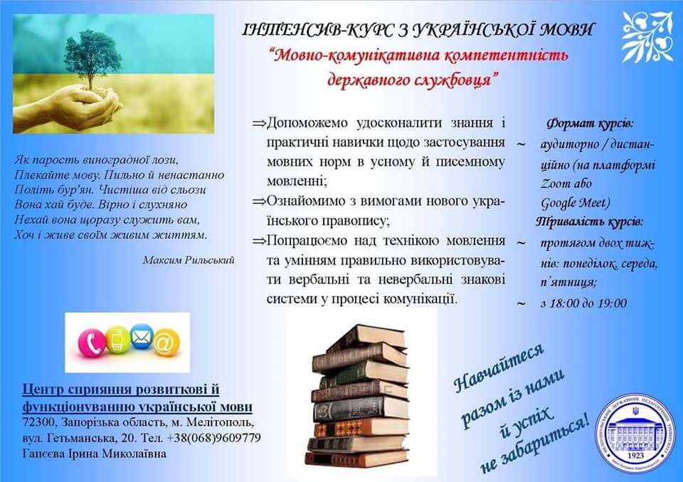 На базі Мелітопольського державного педагогічного університету імені Богдана Хмельницького розпочав свою роботу ЦЕНТР СПРИЯННЯ РОЗВИТКОВІ Й ФУНКЦІОНУВАННЮ УКРАЇНСЬКОЇ МОВИ.Досвідчені фахівці завжди готові допомогти всім охочим підготуватися до складання іспиту на рівень володіння державною мовою; удосконалити знання й практичні навички щодо застосування мовних норм в усному й писемному мовленні; ознайомити з вимогами нового українського правопису; попрацювати над технікою мовлення та умінням доречно використовувати вербальні та невербальні знакові системи у процесі комунікації.
