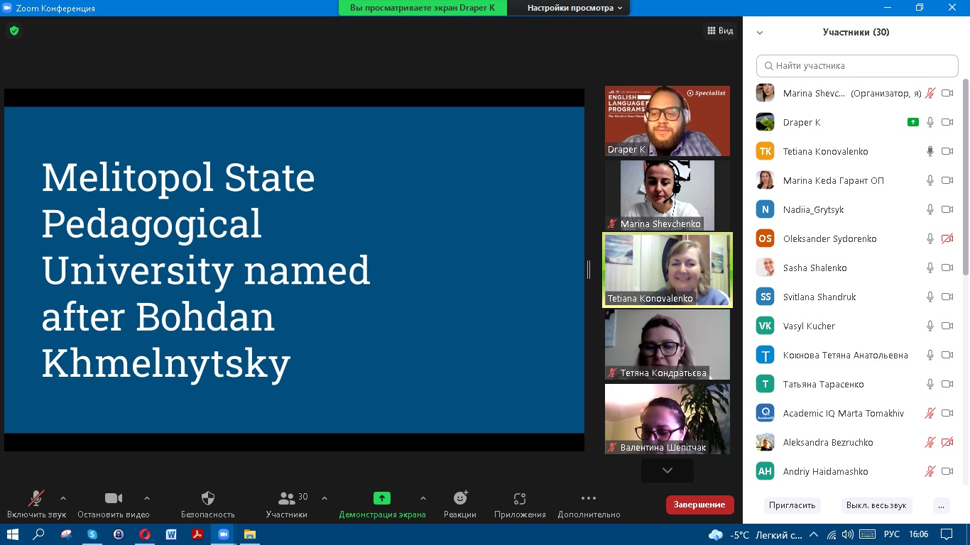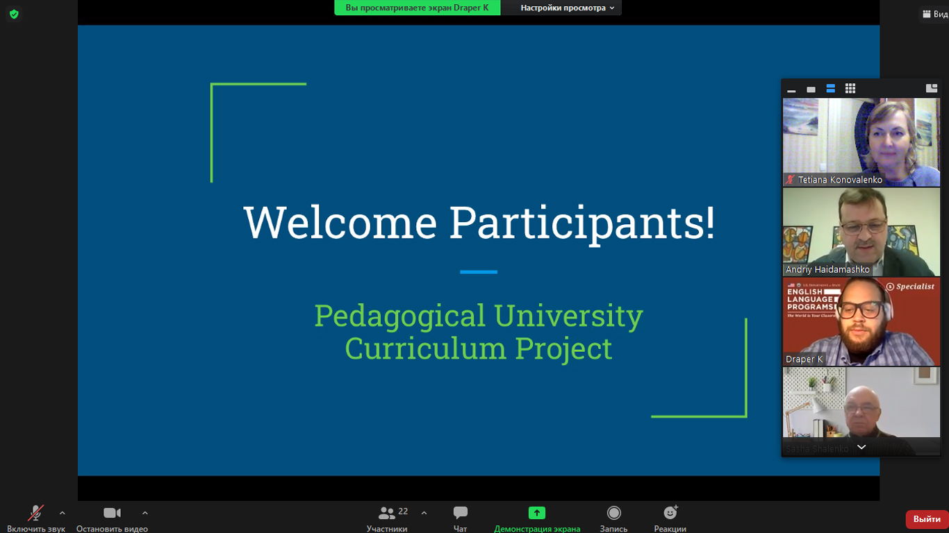 21 грудня 2021 р. гаранти освітніх програм «Середня освіта. Мова і література (англійська, німецька), перша – англійська» за рівнями вищої освіти «бакалавр» і «магістр» Тетяна Коноваленко і Тетяна Тарасенко розпочали свою участь у міжнародному проєкті “Pre-Service English Teacher Methodology Program”, організованому МБО «Консорціум із удосконалення менеджмент-освіти в Україні» і Regional English Language Office, the US Embassy in Ukraine. Проєкт фінансується Посольством США в Україні.