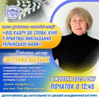 🇺🇦📖Кафедра української філології та зарубіжної літератури запрошує на гостьову лекцію, яка відкриє нові горизонти у викладанні української мови через мистецтво кіно!