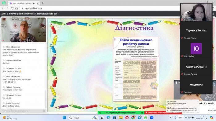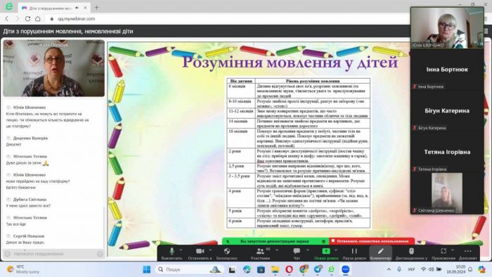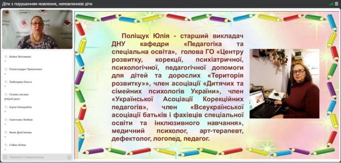 Здобувачі вищої освіти ОП Спеціальна освіта .Логопедія та Початкова освіта. Інклюзивна освіта в рамках вивчення дисциплін першого (бакалаврського) та другого (магістерського) рівнів вищої освіти «Основи інклюзивної педагогіки», «Спеціальна педагогіка з історією логопедії», «Актуальні проблеми спеціальної та інклюзивної освіти», «Інноваційні технології у корекційній роботі з дітьми з порушеннями мовлення», «Корекційна педагогіка» відвідали гостьову лекцію Юлії Поліщук на тему: «Діти з порушенням мовлення, немовленнєві діти. Ігротерапія для дітей з порушенням мовлення».