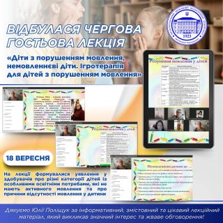 18 вересня 2024 року відбулася гостьова лекція старшого викладача Дніпровського національного університету, яка є головою Громадської організації «Центр розвитку, корекції, психіатричної, психологічної, педагогічної допомоги для дітей та дорослих «Територія розвитку»», членкинеюасоціації «Дитячих та сімейних психологів України» та «Української асоціації корекційних педагогів», медичною психологинею, арт-терапевткою, дефектологинею, логопедом, педагогом, ведучою освітніх вебінарів для фахівців допомагаючих професій Юлії Поліщук на тему: «Діти з порушенням мовлення, немовленнєві діти. Ігротерапія для дітей з порушенням мовлення».
