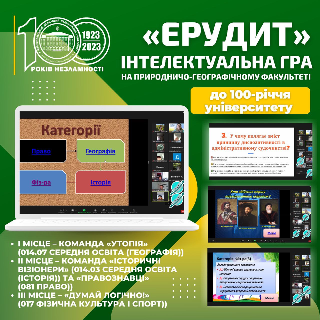 24 жовтня 2023 року на природничо-географічному факультеті студентською радою була проведена традиційна інтелектуальна гра «Ерудит» серед студентів, до 100-річчя Мелітопольського державного педагогічного університету імені Богдана Хмельницького.