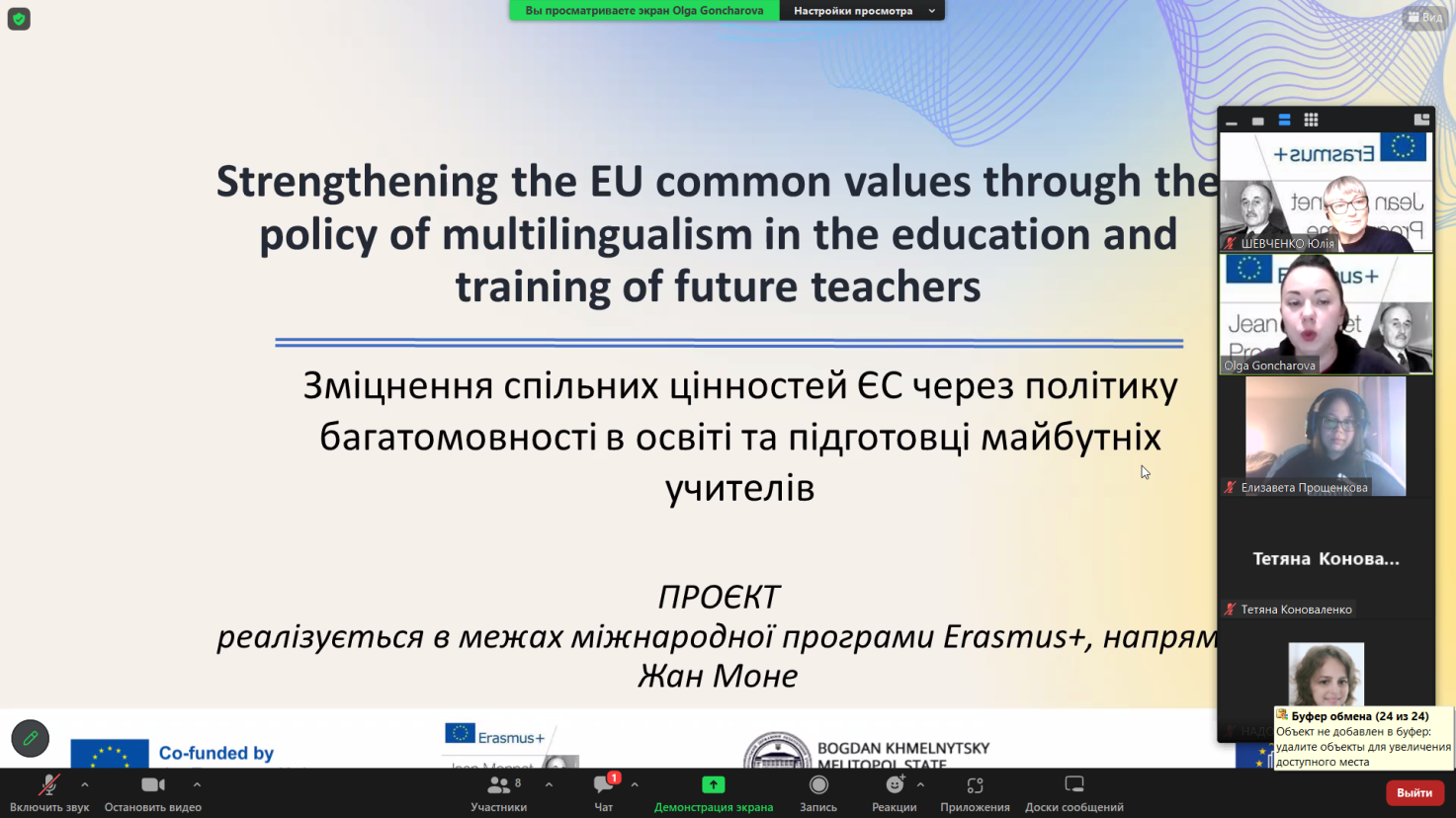 03.03.2023 р. на платформі Zoom відбулась презентація нового навчального курсу «Strengthening the EU common values through the policy of multilingualism in the education and training of future teachers» (Зміцнення спільних цінностей ЄС через політику багатомовності в освіті та підготовці майбутніх учителів) для здобувачів освіти 3 курсу філологічного факультету МДПУ імені Богдана Хмельницького.