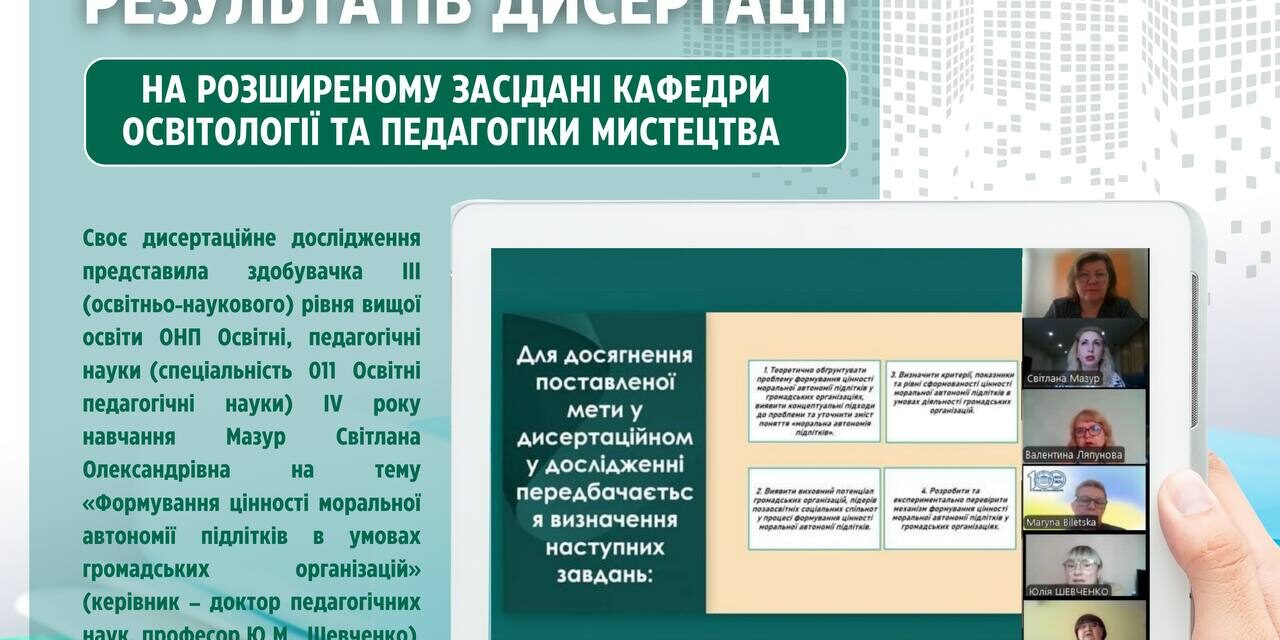 ‼️🏛️ 17 квітня 2025 року відбулось розширене засідання кафедри освітології та педагогіки мистецтва під час якого була представлена публічна презентація наукових результатів дисертації здобувачки ІІІ (освітньо-наукового) рівня вищої освіти ОНП Освітні, педагогічні науки (спеціальність 011 Освітні педагогічні науки) ІV року навчання Мазур Світлани Олександрівни на тему «Формування цінності моральної автономії підлітків в умовах громадських організацій» (керівник – доктор педагогічних наук, професор Ю.М.Шевченко).