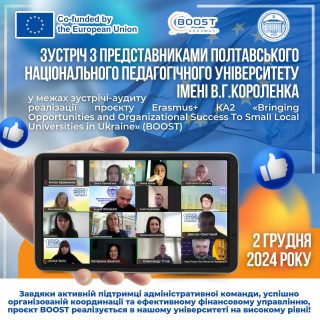 👩🏻💻💫2 грудня 2024 року представники Полтавськогонаціонального педагогічного університету імені В.Г.Короленка доктор педагогічних наук, доктор теологічних наук, професор Василь Фазан та кандидат педагогічних наук, доцент Оксана Дмитрієнко відвідали Мелітопольський державний педагогічний університет імені Богдана Хмельницького у межах зустрічі-аудиту реалізації проєкту Erasmus+ КА2 «Bringing Opportunities and Organizational Success To Small Local Universities in Ukraine» (BOOST).