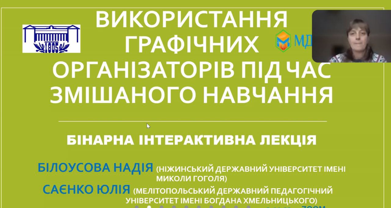 3 листопада 2022 року відбулася бінарна інтерактивна лекція для здобувачів бакалаврського і магістерського рівнів вищої освіти спеціальності 013 Початкова освіта у рамках співпраці Ніжинського державного університету імені Миколи Гоголя з Мелітопольським державним педагогічним університетом імені Богдана Хмельницького з теми: «Використання графічних організаторів під час змішаного навчання» (лектори: канд.пед.наук, доцент кафедри початкової і спеціальної освіти Юлія Саєнко; канд.пед.наук, доцент кафедри педагогіки, початкової освіти, психології та менеджменту Надія Білоусова).
