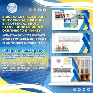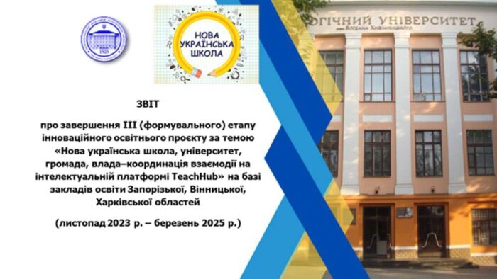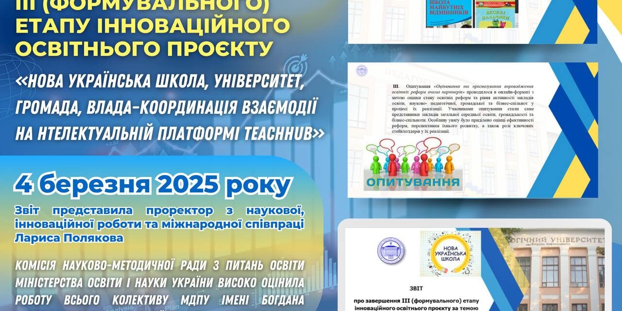 👩🏼💼📚4 березня 2025 року проректор з наукової, інноваційної роботи та міжнародної співпраці Лариса Полякова презентувала перед Науково-методичною комісією інноваційної діяльності та дослідно-експериментальної роботи сектору дошкільної, загальної середньої, професійної (професійно-технічної), позашкільної освіти та виховання Науково-методичної ради з питань освіти Міністерства освіти і науки України 📝🎓 ЗВІТ про завершення ІІІ (формувального) етапу інноваційного освітнього проєкту за темою «Нова українська школа, університет, громада, влада–координація взаємодії на нтелектуальній платформі TeachHub» на базі закладів освіти Запорізької, Вінницької, Харківської областей (листопад 2023 р. – березень 2025 р.)