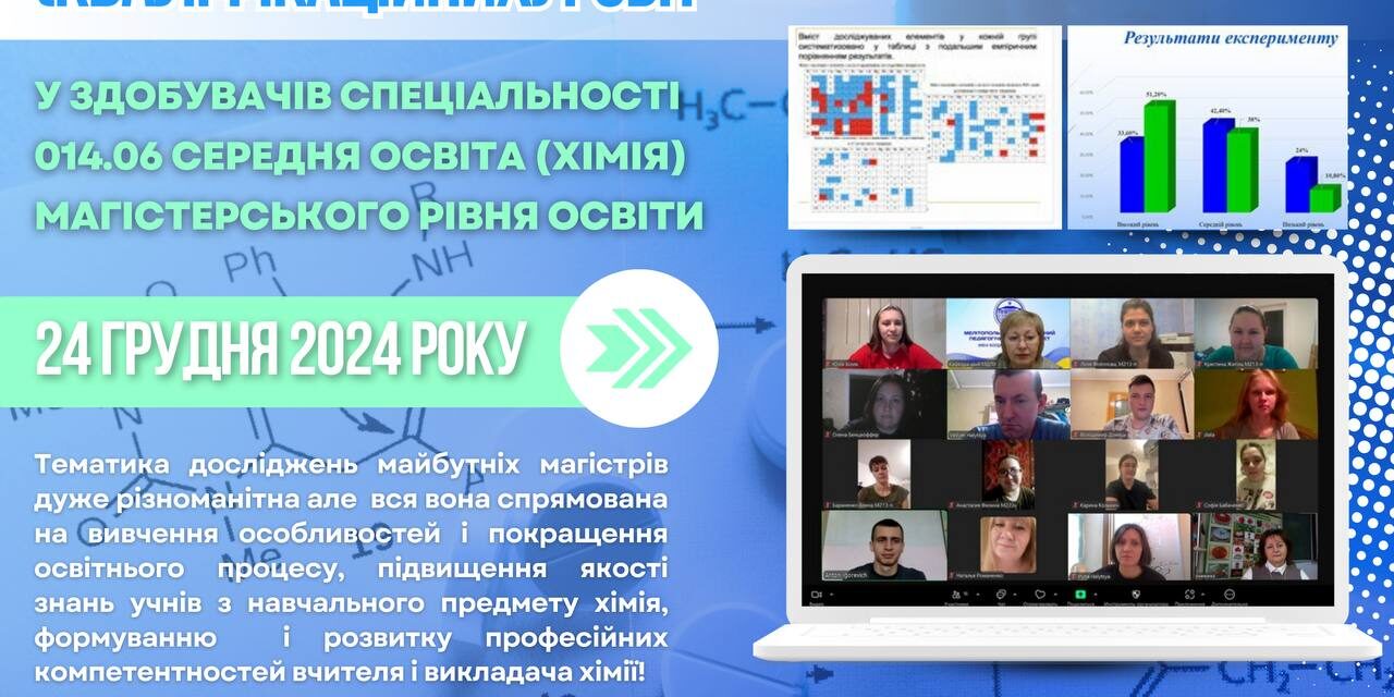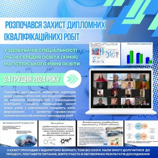 👩🏼🔬🎓24 грудня розпочався захист дипломних (кваліфікаційних) робіт у здобувачів спеціальності 014.06 Середня освіта (Хімія) магістерського рівня освіти.
