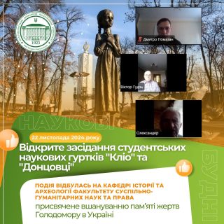 📚👩🏼🎓22 листопада 2024 року на кафедрі історії та археології відбулося відкрите засідання студентських наукових гуртків “Кліо” та “Донцовці”, присвячене вшануванню пам’яті жертв Голодомору.