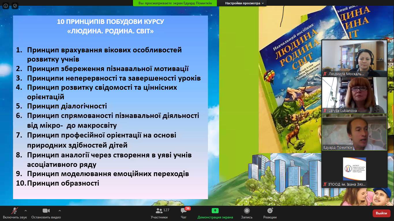 Перед учасниками вебінару виступили автори курсу: «Людина. Родина. Світ»: Людмила Юріївна Москальова – доктор педагогічних наук, професор, проректор з наукової роботи Мелітопольського державного педагогічного університету імені Богдана Хмельницького, і Едуард Олександрович Помиткін – доктор психологічних наук, професор, провідний науковий співробітник відділу психології праці ІПООД імені Івана Зязюна НАПН України.