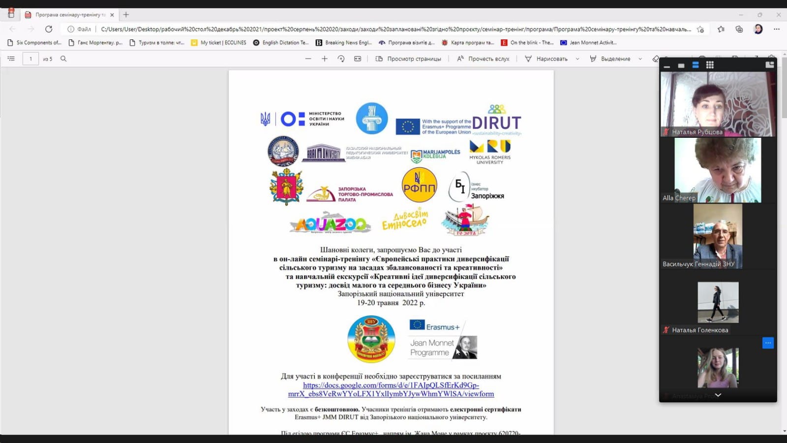 Викладачі кафедри управління та адміністрування 19.05.2022 р. взяли участь в он-лайн семінарі-тренінгу «Європейські практики диверсифікації сільського туризму на засадах збалансованості та креативності» та навчальній екскурсії «Креативні ідеї диверсифікації сільського туризму: досвід малого та середнього бізнесу України», що відбувся на базі Запорізького національного університету під егідою програми ЄС Еразмус+, напрям ім. Жана Моне у рамках проєкту 620720-EPP-1-2020-1-UA-EPPJMO-MODULE «Диверсифікація сільського туризму через збалансованість та креативність: поширення європейського досвіду в Україні»/«Diversification of rural tourism through sustainability and creativity: disseminating European experience in Ukraine».