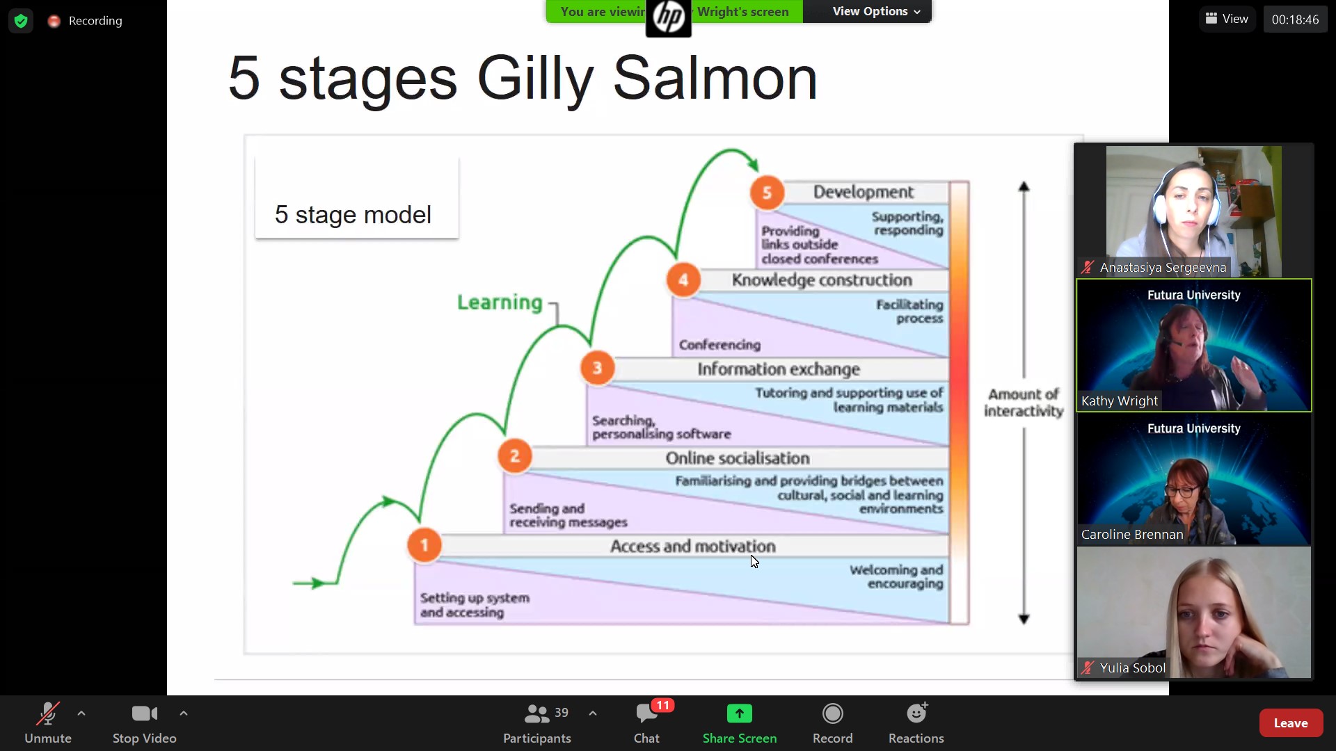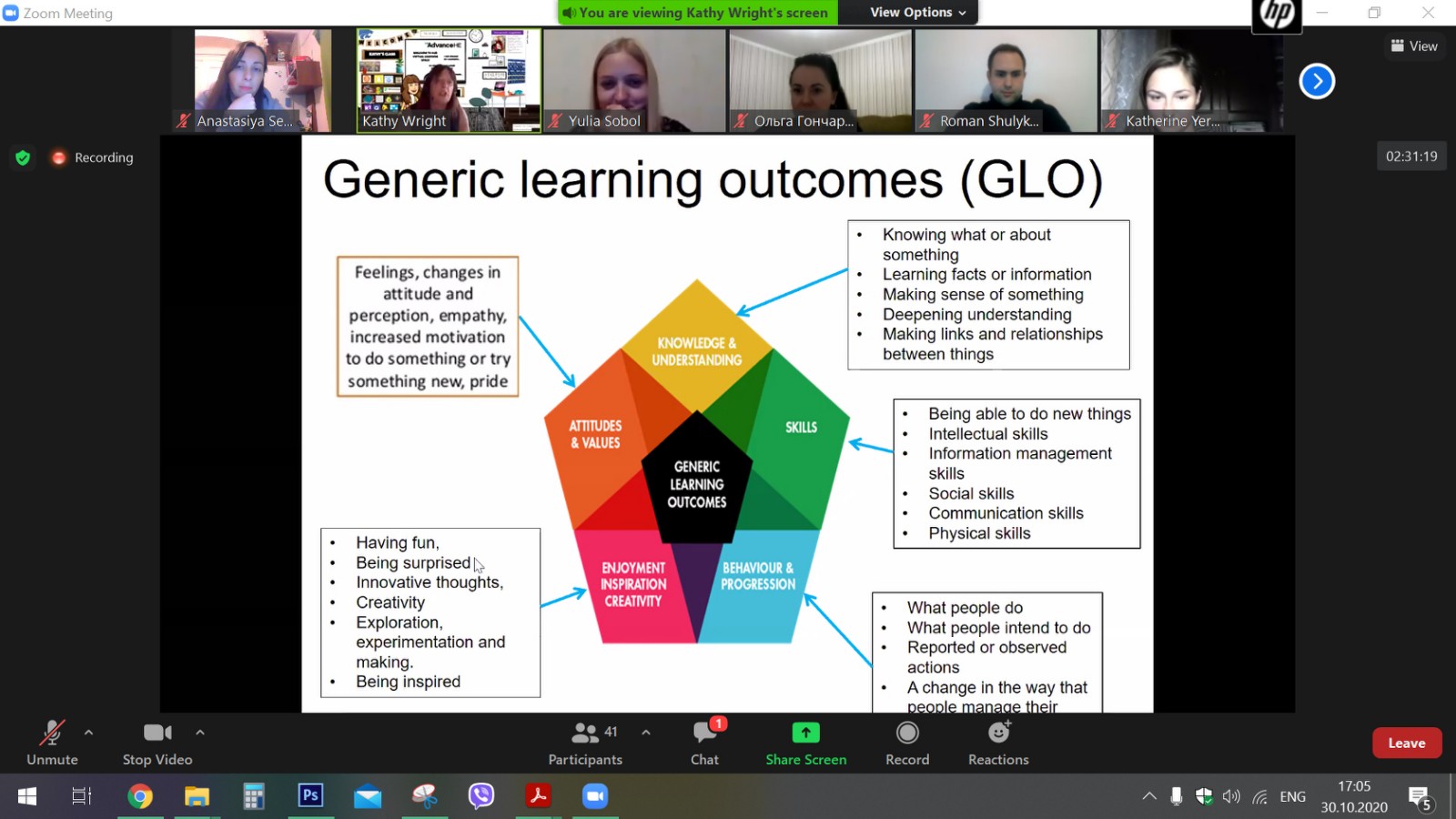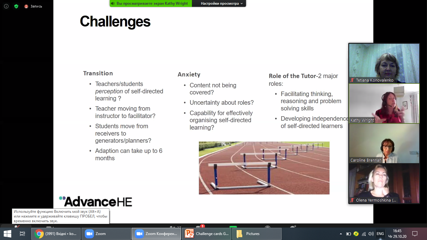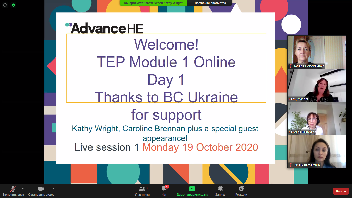 У період з 19 по 30 жовтня 2020 р. Ольга Гончарова, Тетяна Коноваленко та Анастасія Яковенко пройшли перший модуль «Delivering Learning and Teaching in Higher Education» в асинхронному та синхронному онлайн навчанні, яке здійснювали досвідчені тренери Advance HE організації Kathy Wright і Caroline Brennan. Упродовж тренінгів відбулось занурення у такі теми: Curriculum design: designing modules and programmes, Creative and innovative approaches to learning and teaching, High impact pedagogies, Developing your practice in response to online teaching, Developing digital capabilities of staff and students, Capturing Innovation, Change to practice and its Impact, а також представлено сучасні підходи до реалізації освітньої діяльності Problem and Enquiry Based Learning, Collaborative learning, ‘Gamification’ and Game-based learning, Simulation і Narrative.