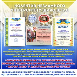 👩🏻🎓👏🏻 Колектив Мелітопольського державного педагогічного університету імені Богдана Хмельницького щиро вітає Балашову Вікторію – здобувачку 2 курсу першого (бакалаврського) рівня вищої освіти спеціальності “Дошкільна освіта” факультету соціально-педагогічної та мистецької освіти – з вагомим науковим досягненням!
