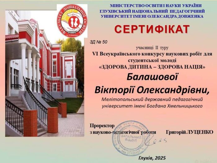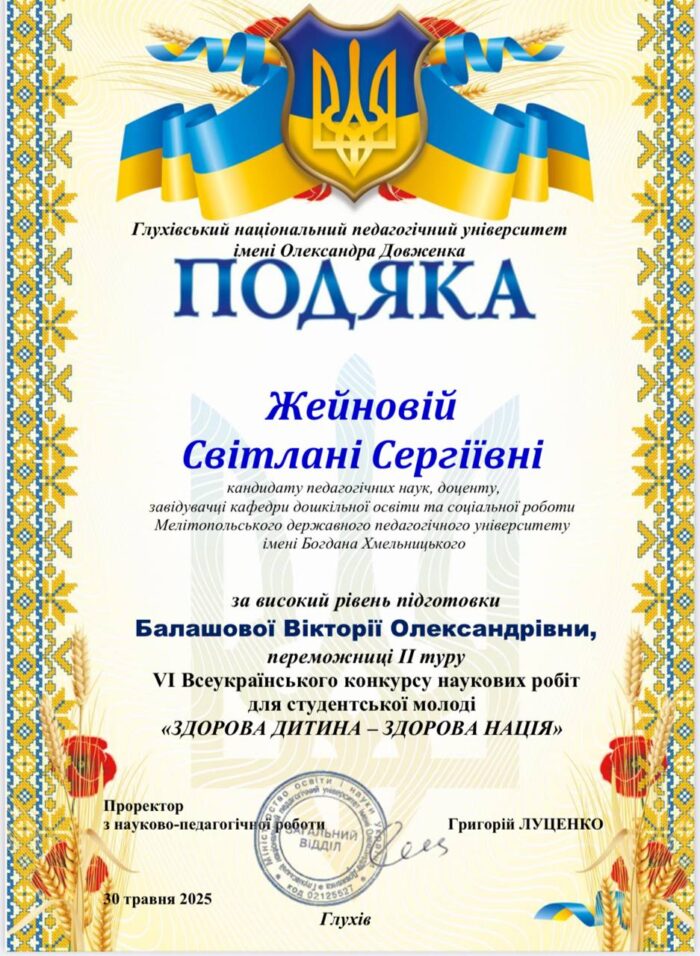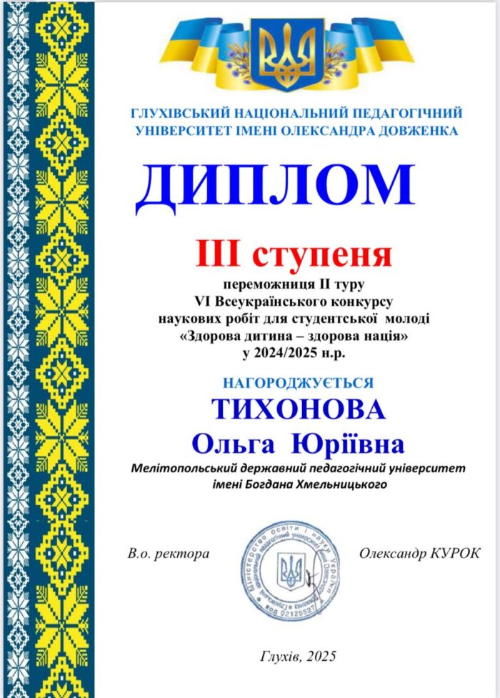 🥳🥉 Вікторія виборола ДИПЛОМ ІІІ СТУПЕНЯ, ставши призеркою ІІ туру VI Всеукраїнського конкурсу студентських наукових робіт “Здорова дитина – здорова нація” у 2024/2025 навчальному році!