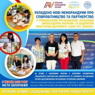 ✍🏻⭐️3 червня 2025 року укладено Меморандуми про співробітництво та партнерство з громадською організацією «Асоціація амбасадорок України» (м. Київ) та відкритим простором допомоги «Саме тут. Дніпро» (м. Дніпро).