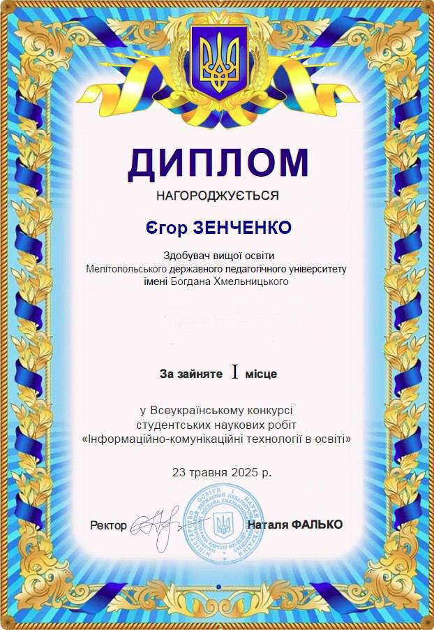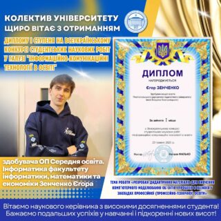 🙋🏻♂️🥳Щиро вітаємо здобувача освітньої програми “Середня освіта. Інформатика” Зенченка Єгора з отриманням Диплому І ступеня у II турі Всеукраїнського конкурсу студентських наукових робіт у галузі “Інформаційно-комунікаційні технології в освіті”!
