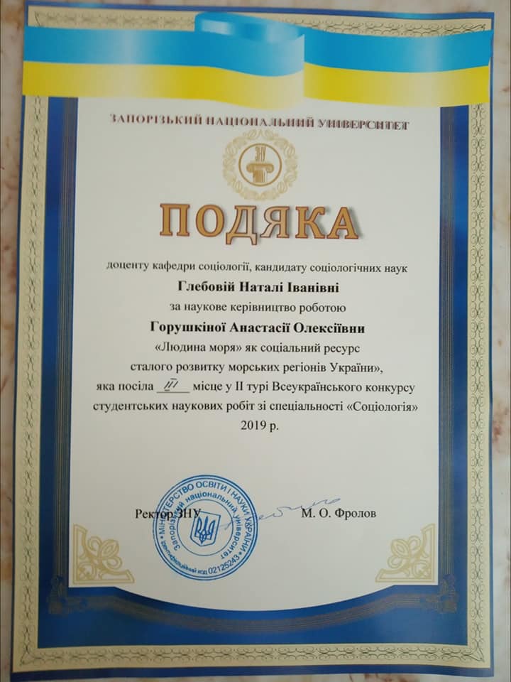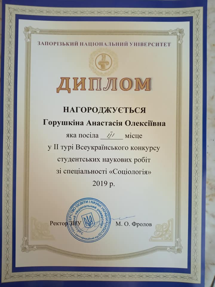 Професорсько-викладацький і студентський колективи Мелітопольського державного педагогічного університету імені Богдана Хмельницького вітають студентку 4 курс факультету інформатики, математики та економіки спеціальності «Соціологія» ГОРУШКІНУ Анастасію Олексіївну, яка посіла почесне ІІІ місце у Всеукраїнському конкурсі студентських наукових робіт зі спеціальності «Соціологія» (науковий керівник – кандидат соціологічних наук, доцент кафедри соціології Глебова Н.І.).