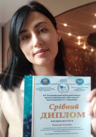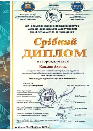 23-24 квітня 2021 року у м.Ніжин відбувся ХІХ Всеукраїнський юніорський конкурс музично-виконавської майстерності імені академіка О.С.Тимошенко, в якому прийняла участь магістрантка І курсу кафедри інструментального виконавства та музичного мистецтва естради Навчально-наукового інституту соціально-педагогічної та мистецької освіти Каплюк Альона.