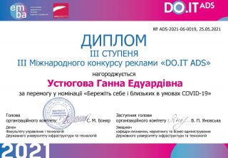 Професорсько-викладацький і студентський колективи університету вітають студентку ОП «Цифровий дизайн» Ганну Устюгову та її керівницю – професора кафедри інформатики і кібернетики Катерину Осадчу з перемогою в III-му Міжнародному конкурсі реклами «DO.IT ADS»!