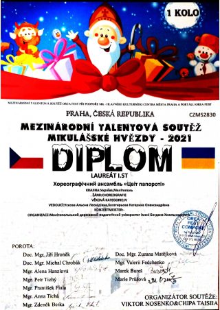 Хореографічний ансамбль «Цвіт папороті» Мелітопольського державного педагогічного університету імені Богдана Хмельницького прийняв участь у Міжнародному багатожанровому двотуровому конкурсі «Mezinárodní talentová soutěž – Mikulašské hvězdy 2021» («Миколайські зірки – 2021»), який проходив при підтримці Міністерства культури та сприяння головного управління культури міста Прага, Чеська Республіка в рамках міжнародного проєкту Україна-Чехія.