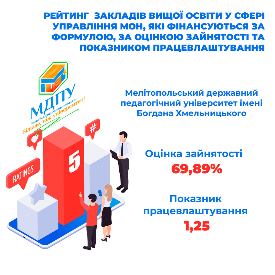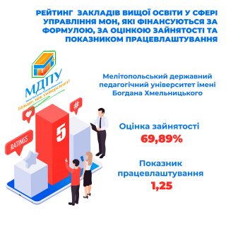 Мелітопольський державний педагогічний університет імені Богдана Хмельницького посів 5-е місце (серед 138-ми ЗВО України) у рейтингу закладів вищої освіти у сфері управління МОН, які фінансуються за формулою, за оцінкою зайнятості та показником працевлаштування, маючи найвищий показник працевлаштування (1,25) та оцінку зайнятості 69,89%!