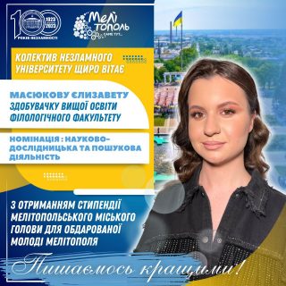 Колектив Незламного МДПУ імені Богдана Хмельницького вітає здобувачку вищої освіти IV року навчання за освітнім ступенем «Бакалавр» спеціальності 035.041 (Філологія. Германські мови та літератури) філологічного факультету МАСЮКОВУ ЄЛИЗАВЕТУ СЕРГІЇВНУ з призначенням стипендії Мелітопольського міського голови для обдарованої молоді!