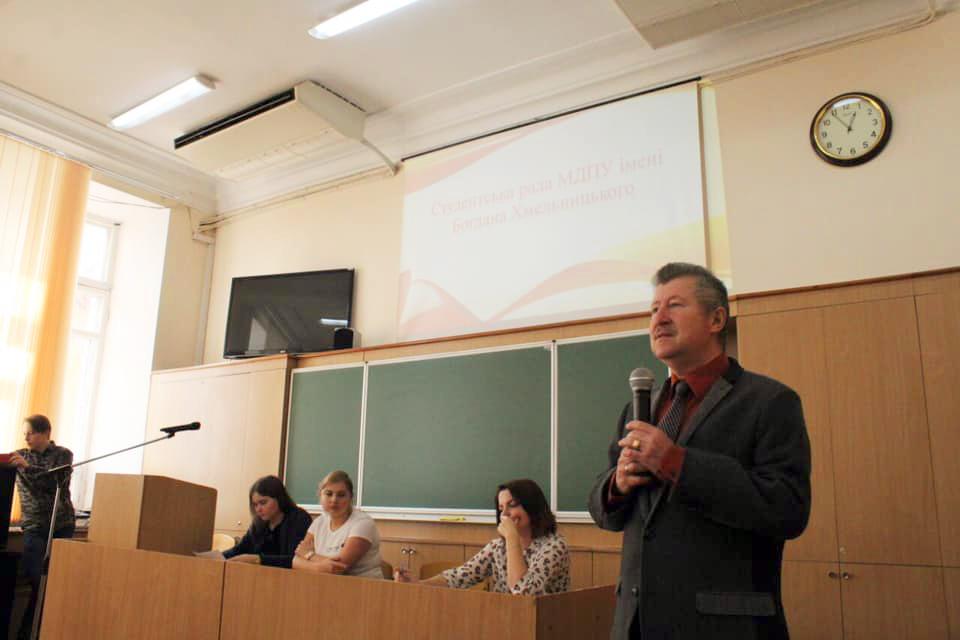 Напутніми словами студентів привітав ректор університету Солоненко Анатолій Миколайович. Куратор з виховної роботи Муртазієв Ернест Гафарович та кураторка з національно-патріотичного виховання Полякова Лариса Іванівна збудили дух патріотизму і згуртованості в молодих людях.