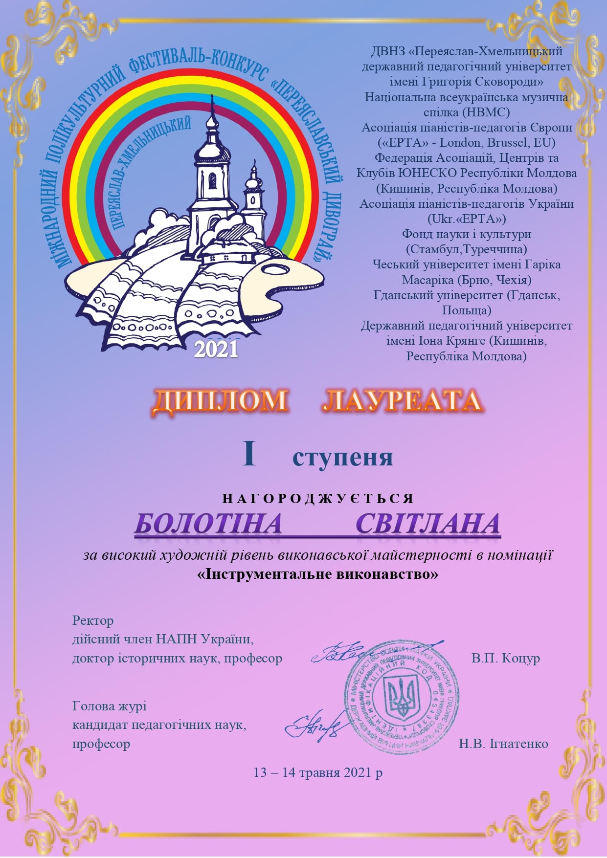 Диплом лауреата І ступеня – студентка Навчально-наукового інституту соціально-педагогічної та мистецької освіти Болотіна Світлана, керівник – доцент кафедри інструментального виконавства та музичного мистецтва естради Ірина Стотика.