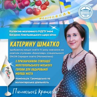 🏛️💫 Колектив Незламного МДПУ імені Богдана Хмельницького щиро вітає здобувачку вищої освіти IV курсу бакалаврату, спеціальності 014.04 Середня освіта (Математика) факультету інформатики, математики та економіки ШМАТКО КАТЕРИНУ ‼️👏🏻 з отриманням стипендії Мелітопольського міського голови для обдарованої молоді міста у номінації «Громадська та волонтерська діяльність»!