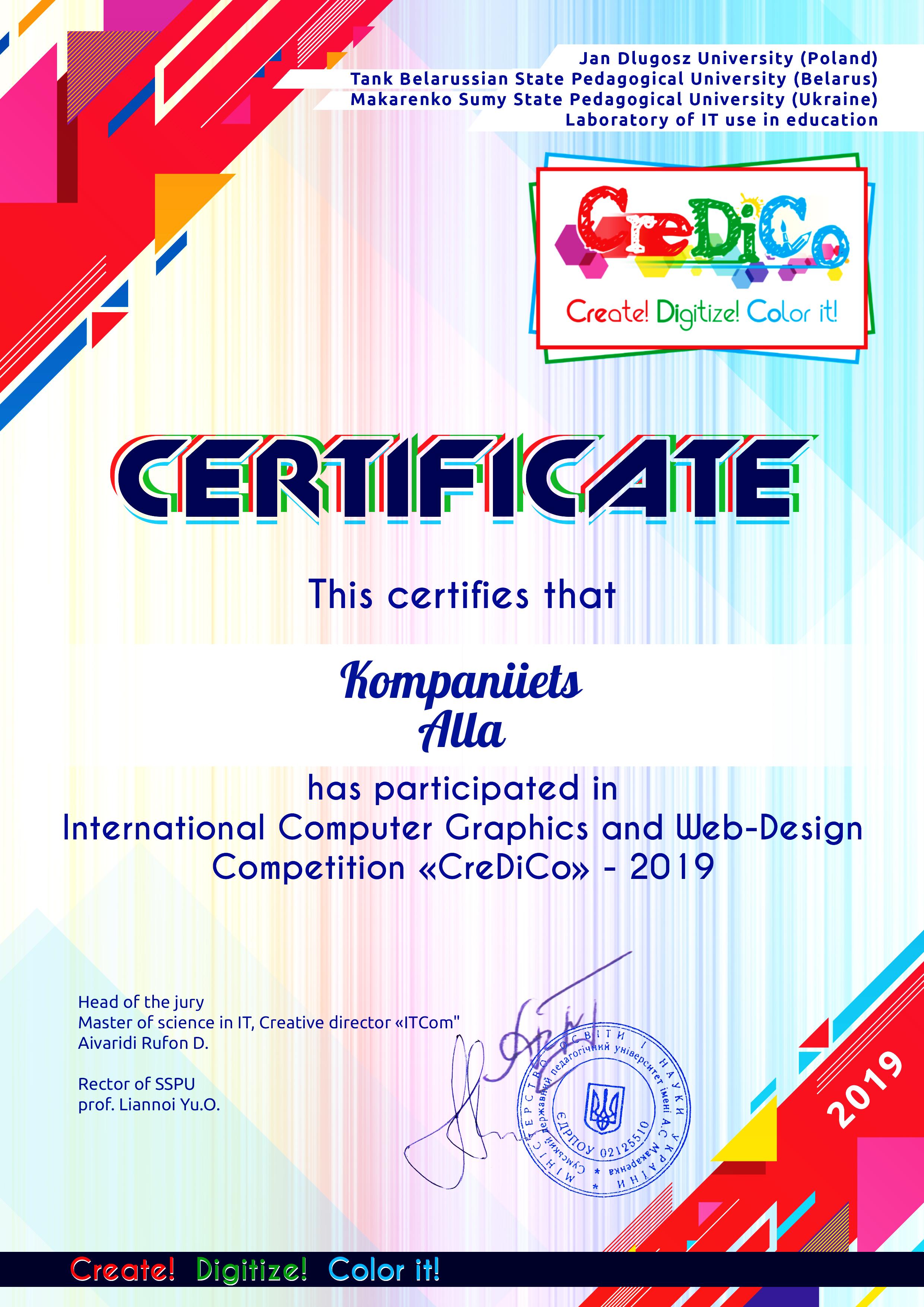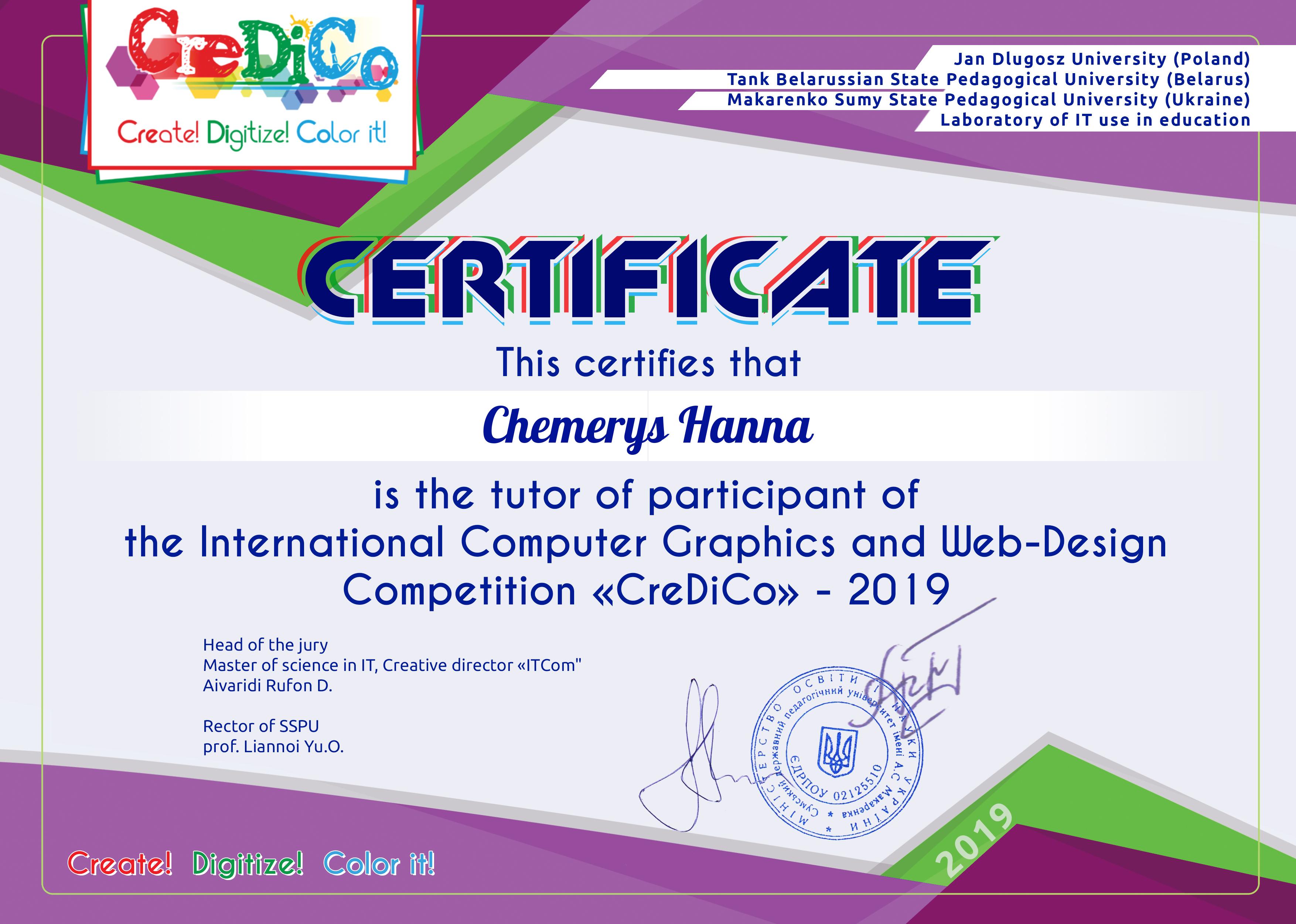 Міжнародний конкурс з комп’ютерної графіки та веб-дизайну «CreDiCo» проводиться за сприяння Лабораторії використання інформаційних технологій в освіті при кафедрі інформатики Сумського державного педагогічного університету імені А.С. Макаренка (Україна), Академії Яна Длугоша (Польща) та Білоруського державного педагогічного університету імені М. Танка (Білорусь) серед молоді, яка цікавиться і займається вивченням комп’ютерної графіки і анімації. Тематикою 2019 року стала «Школа майбутнього».