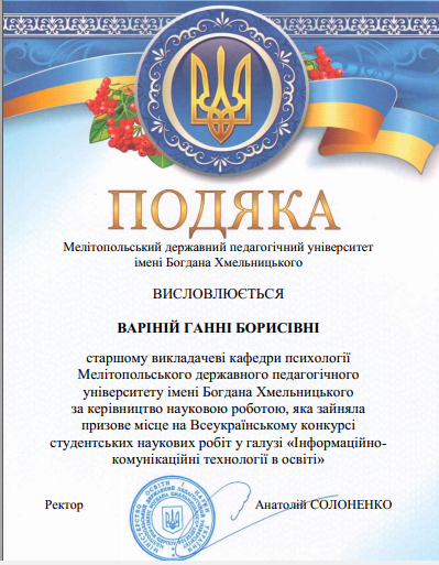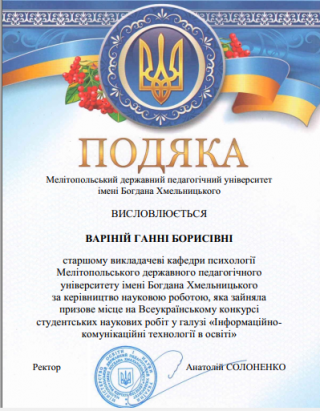Вітаємо талановиту студентку з отриманням визнання на Всеукраїнському конкурсі та бажаємо нових перемог, подальших успіхів у навчанні і розпочатій науково-дослідній роботі.