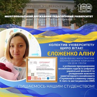 Студентка магістратури заочної форми навчання ум 23 М групи Єложенко Аліна взяла участь у лексикографічному проєкті та упродовж семестру з 18 вересня по 12 грудня 2023 р. навчалася за стипендіальною програмою на онлайнових курсах із цифрової української філології за підтримки Єнського університету імені Фрідріха Шиллера.