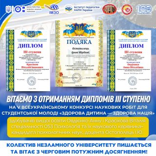 ‼️🇺🇦У номінації «053 Психологія» учасники з Мелітопольського державного педагогічного університету імені Богдана Хмельницького – здобувачка вищої освіти першого (бакалаврського) рівня Овдієнко Анна і здобувач другого (магістерського) рівня Красіков Віталій спеціальності 053 Психологія (науковий керівник – кандидат психологічних наук, доцент Остополець І.Ю.) 🏆🎓блискуче захистили наукову роботу за темою «Вплив розлучення батьків на психічне здоров’я дитини», стали переможцями та отримали – ДИПЛОМИ ІІІ СТУПЕНЯ!