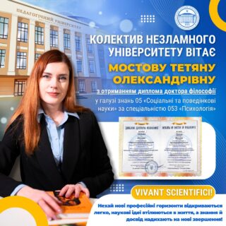 💐👩🏻🎓 Професорсько-викладацький склад, спільнота аспірантів і студентів Мелітопольського державного педагогічного університету імені Богдана Хмельницького щиро вітає старшого викладача кафедри психології Мостову Тетяну Олександрівну з отриманням диплома доктора філософії у галузі знань 05 «Соціальні та поведінкові науки» за спеціальністю 053 «Психологія»!