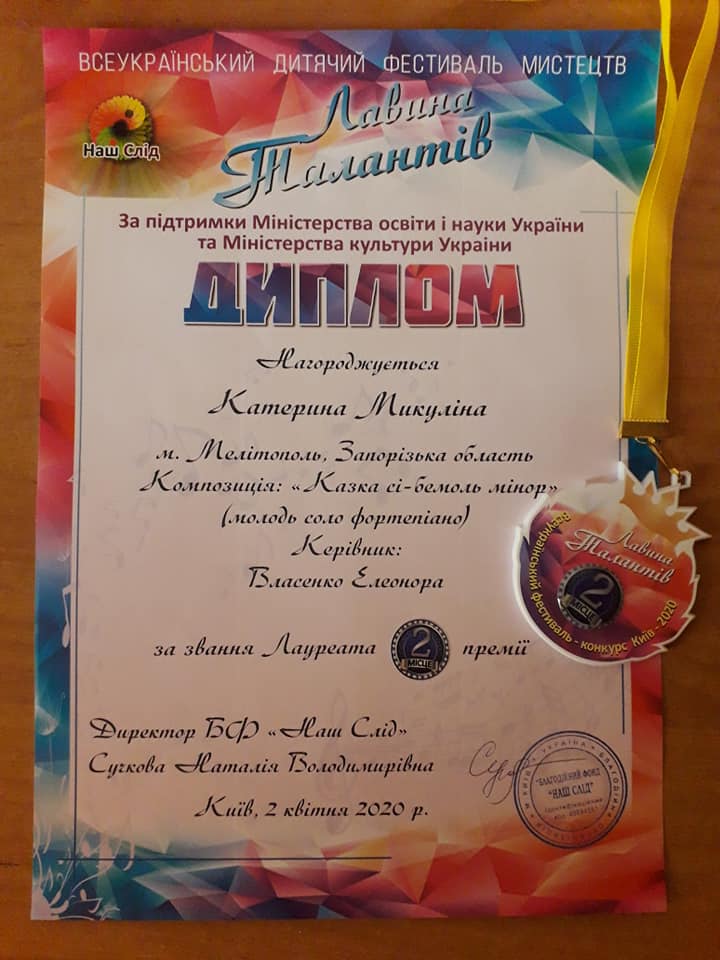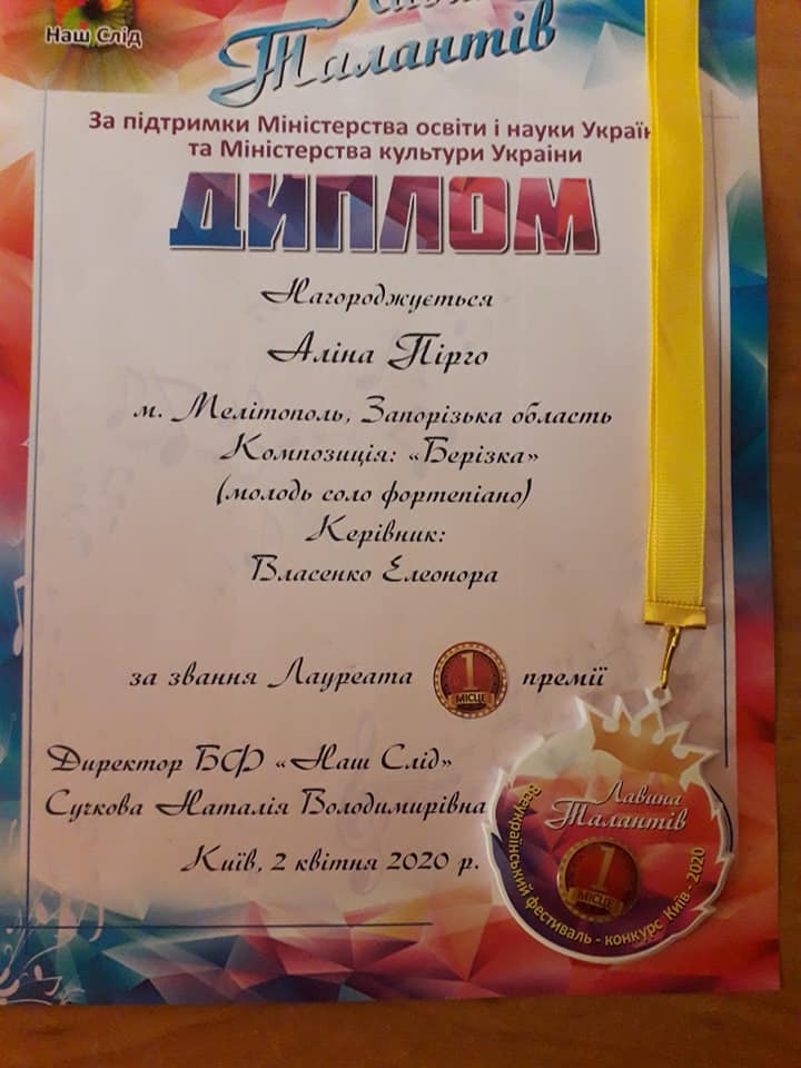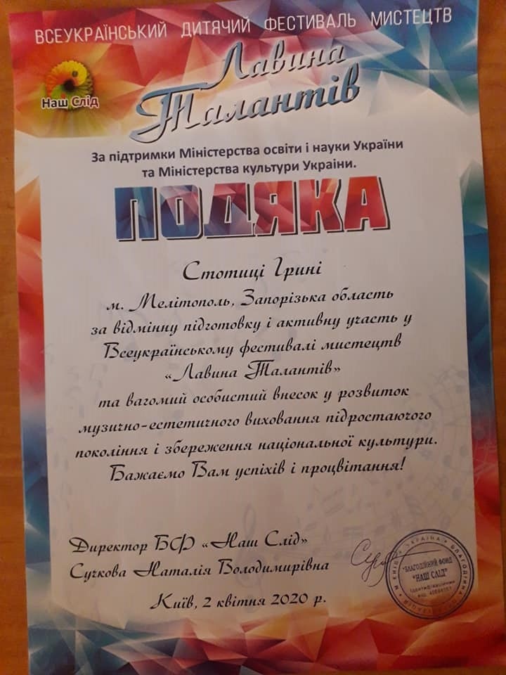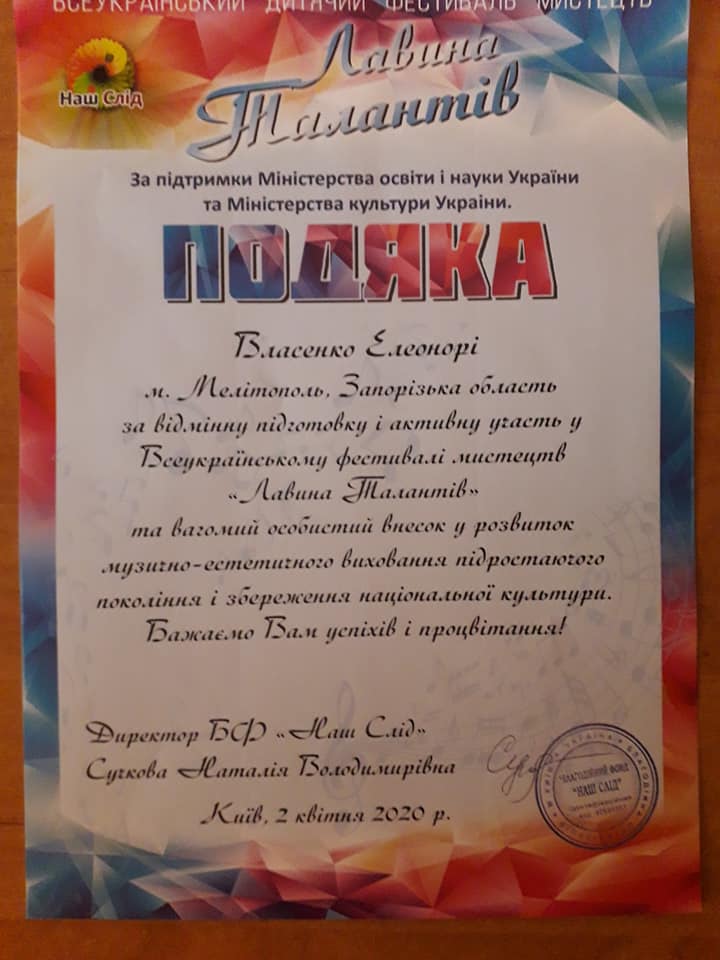 В квітні 2020 р., за підтримки Міністерства освіти і науки України та Міністерства культури України (м. Київ), у дистанційному форматі проходив Всеукраїнський фестиваль мистецтв «Лавина Талантів».