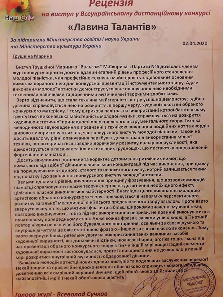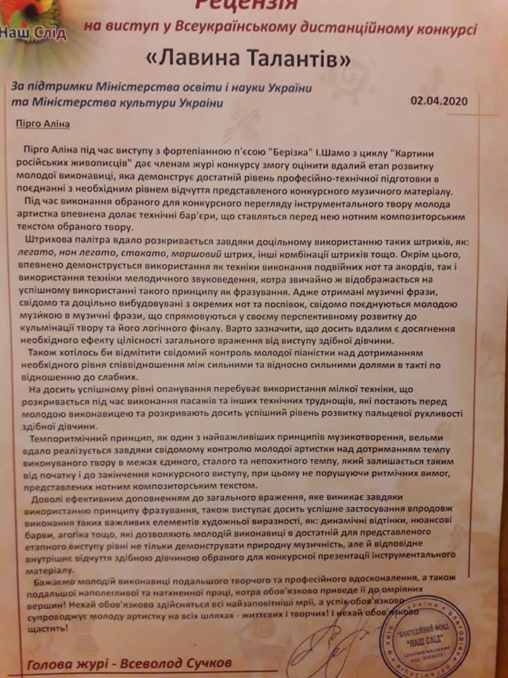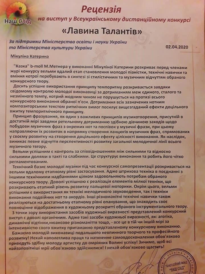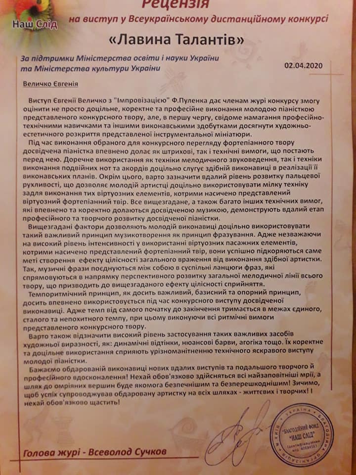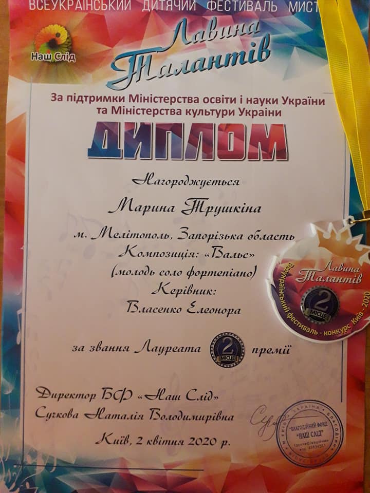 В квітні 2020 р., за підтримки Міністерства освіти і науки України та Міністерства культури України (м. Київ), у дистанційному форматі проходив Всеукраїнський фестиваль мистецтв «Лавина Талантів».