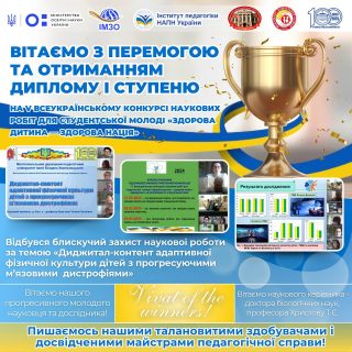 «Диджитал-контентадаптивної фізичної культури дітей з прогресуючими м’язовими дистрофіями», став переможцем та отримав найвищу відзнаку – ДИПЛОМ І СТУПЕНЯ.