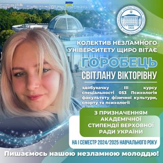 🏛️💐Ректорат, науково-педагогічний колектив та студентство Мелітопольського державного педагогічного університету імені Богдана Хмельницького щиро вітають здобувачку ІІІ курсу спеціальністі 053 Психологія ГОРОБЕЦЬ СВІТЛАНУ з призначенням іменної академічної стипендії Верховної Ради України!